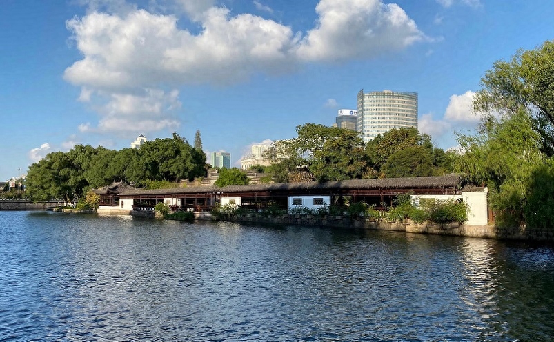 月湖公园,不仅是一座婉约秀美的江南园林,还拥有高丽使馆遗址、佛教居士林、银台第官宅博物馆、贺秘监祠等景点,眼前的建筑粉墙黛瓦、古色古香,疏影横斜中别有情趣。