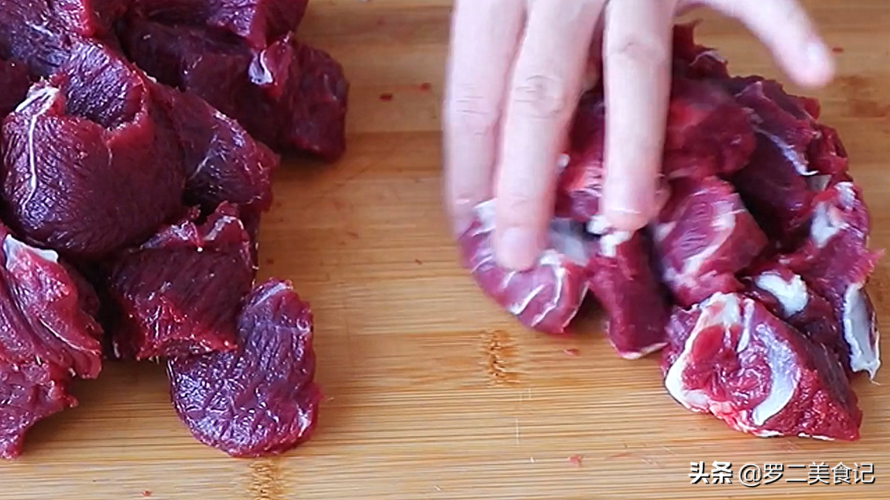 2.用刀把牛肉切成小块,带筋膜的牛肉切小块一点,后面要分开。