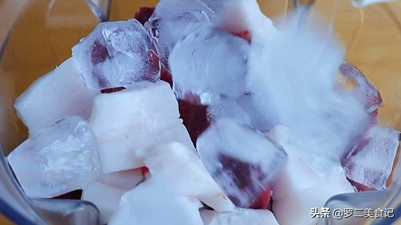 4.其他牛肉放入料理机中,往里面加入1克肥肉,180克冰块。开启按键,把肉打成糜。肥肉是猪肉,牛肉是很少肥油的。