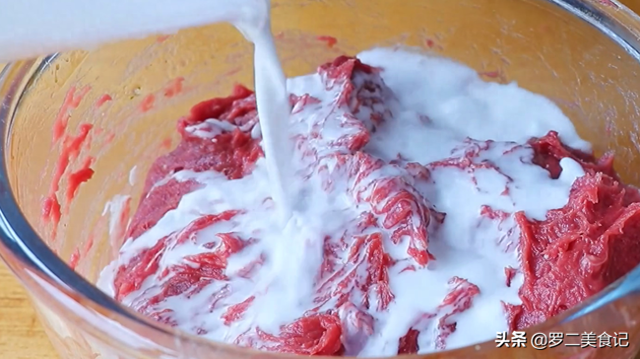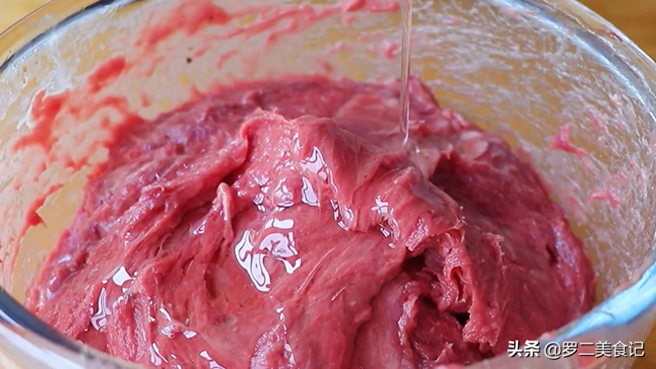 7.带上手套顺着一个方向搅拌,搅打至上劲,牛肉会非常粘稠,并且会拉丝的程度就可以了。