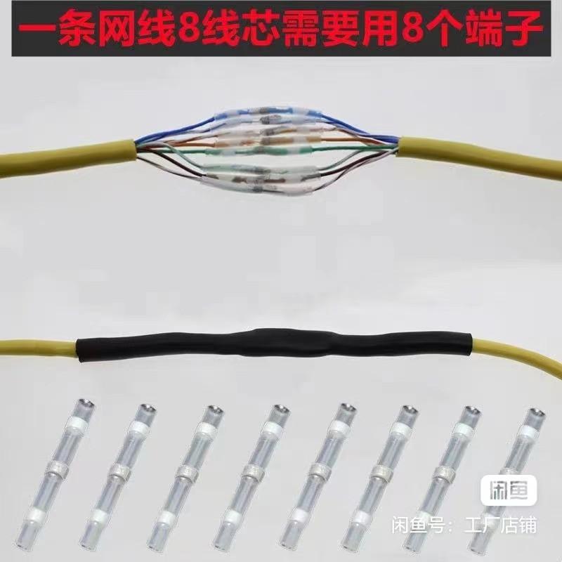 第四种方法就是用带焊锡的对接端子,这种方法是对第一种电线扭接方法的延伸。这种对接端子是一段透明的热缩管,里面带了一片焊锡,先套上对接端子,把两芯网线扭接好后,然后用打火机烘烤,热缩管会收缩,同时里边的低温焊锡会融化,把扭接的网线就焊在一起了。这种对接方法接线效果极佳,基本不会影响网络信号传输和POE电流传输,和原网线没有什么区别。我一般都用这种接线端子来对接网线,经过长期实践,几乎不会出任何问题,特别推荐大家使用。