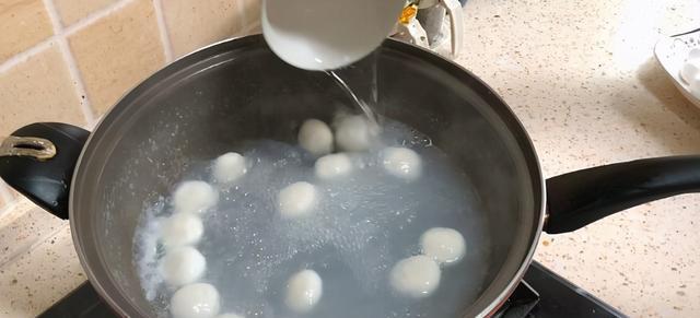 3,待汤圆都慢慢的飘浮起来后,再添入少量的凉水,再煮3分钟。