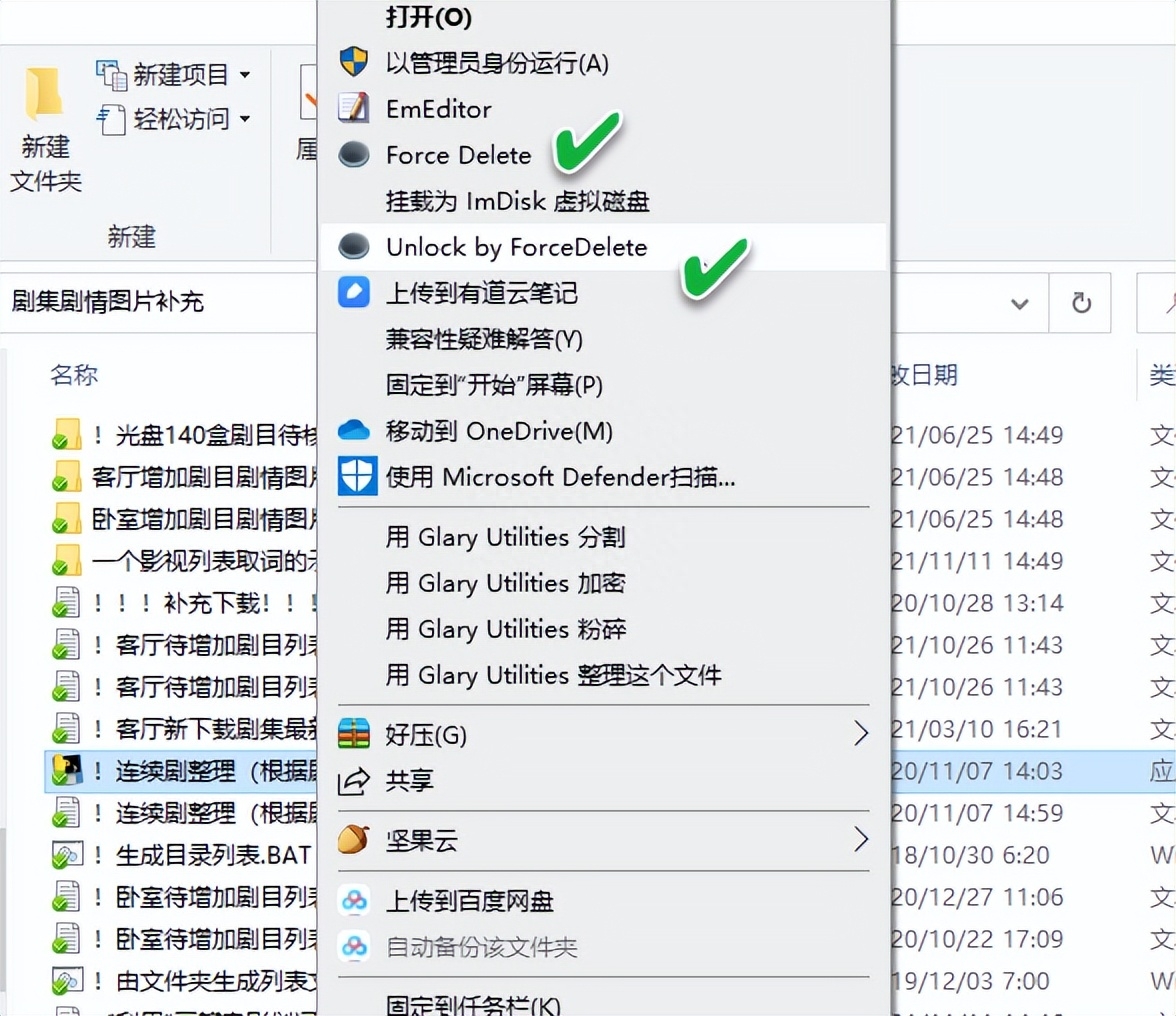这样,我们便可以在文件资源管理器中用右键来进行操作:右键单击任意一个文件,在弹出的菜单中可以看到“Force Delete”和“Unlock by ForceDelete”两个选项。选前者可以强制删除文件,选后者则可以强制解除对文件的锁定。