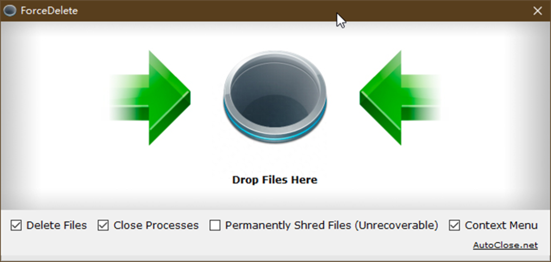 之后,在我们需要删除文件时,只需打开该软件的窗口,选中“Delete Flies”和“Close Processes”选项,然后将欲删之文件拖拽到窗口中间的“黑洞”中即可。软件默认会在文件的右键菜单中添加两个与该软件相关的选项。若未能发现这些选项,请勾选窗口右下角的“Context Menu”选项。