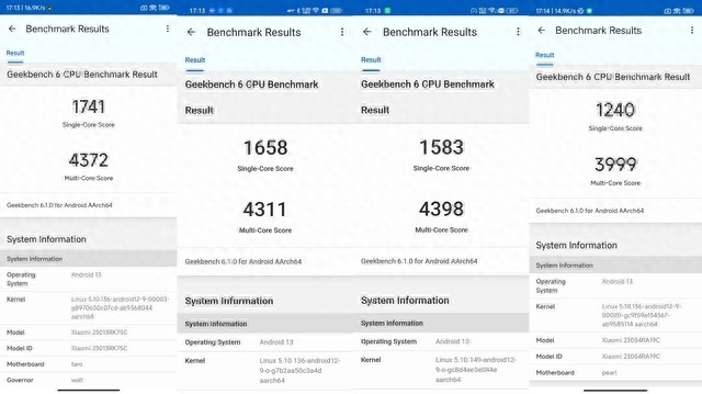 GeekBench 6中,搭载骁龙8+的Redmi K60单核分数为1741分,多核分数为4372分;搭载骁龙7+ Gen2的真我GT Neo5 SE单核分数为1658分,多核分数为4311分;搭载天玑9的一加Ace 2V单核分数为1583分,多核分数为4398分;搭载天玑82的Redmi Note 12T Pro单核分数为1240分,多核分数为3999分。