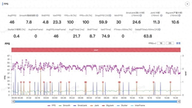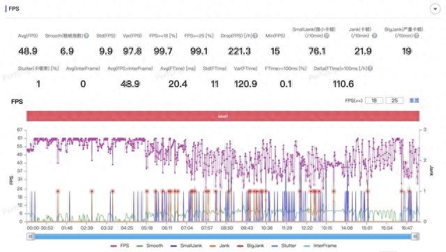 可以看到,采用骁龙8+的Redmi K60在帧率表现上自然是最好的,在前5分钟还算平稳,但在5分钟后,帧率曲线就像过山车一样,实在不算好看,最终平均帧率为48.9fps。