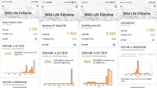 3D Mark Wild Life Extreme中,搭载骁龙8+的Redmi K60分数为2720分;搭载骁龙7+ Gen2的真我GT Neo5 SE分数为1953分;搭载天玑9的一加Ace 2V分数为2342分;搭载天玑82的Redmi Note 12T Pro分数为17分。
