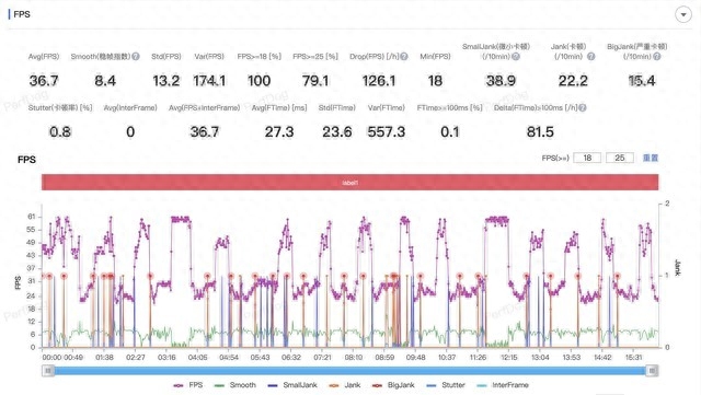 配备天玑9的一加Ace 2V在帧率表现上有点离谱,全程在30与60间左右横跳,反映到游戏上就是你能明显感觉到跑动时而流畅时而卡顿,最终平均帧率为36.7fps。