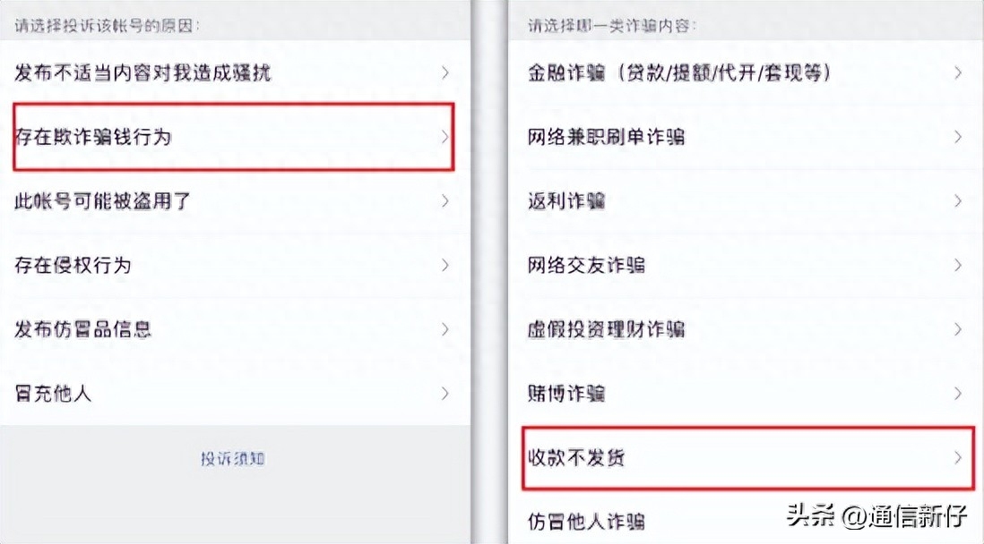 我们选择投诉原因——【存在欺诈骗钱行为】,这里有很多种诈骗类型,选择一个你被骗的行为——【收款不发货】。