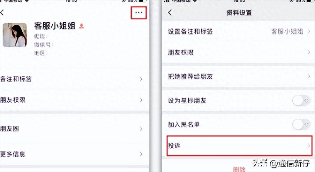 还有一种是被骗转账,比如在微信上交易,你付款了,对方不发货,首先第一步点开对方的头像,然后点击右上角的三个点,这里有个【投诉】功能。