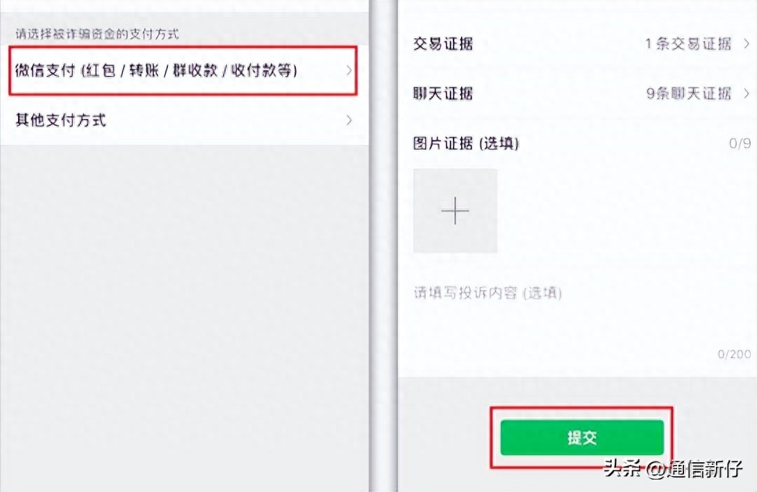 接着选择诈骗资金的支付方式,转账就属于【微信支付】,上传交易证据和聊天证据,如果有图片证据也上传,最后点击【提交】就可以了。