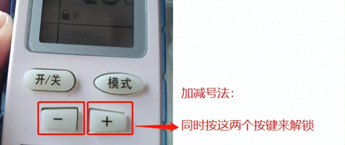 (2)加减号法。在空调遥控器上有一个“+”和“-”号的按键,选择这两个按键同时往下按就是开锁和解锁的模式,这也是一个便捷的解锁方式。