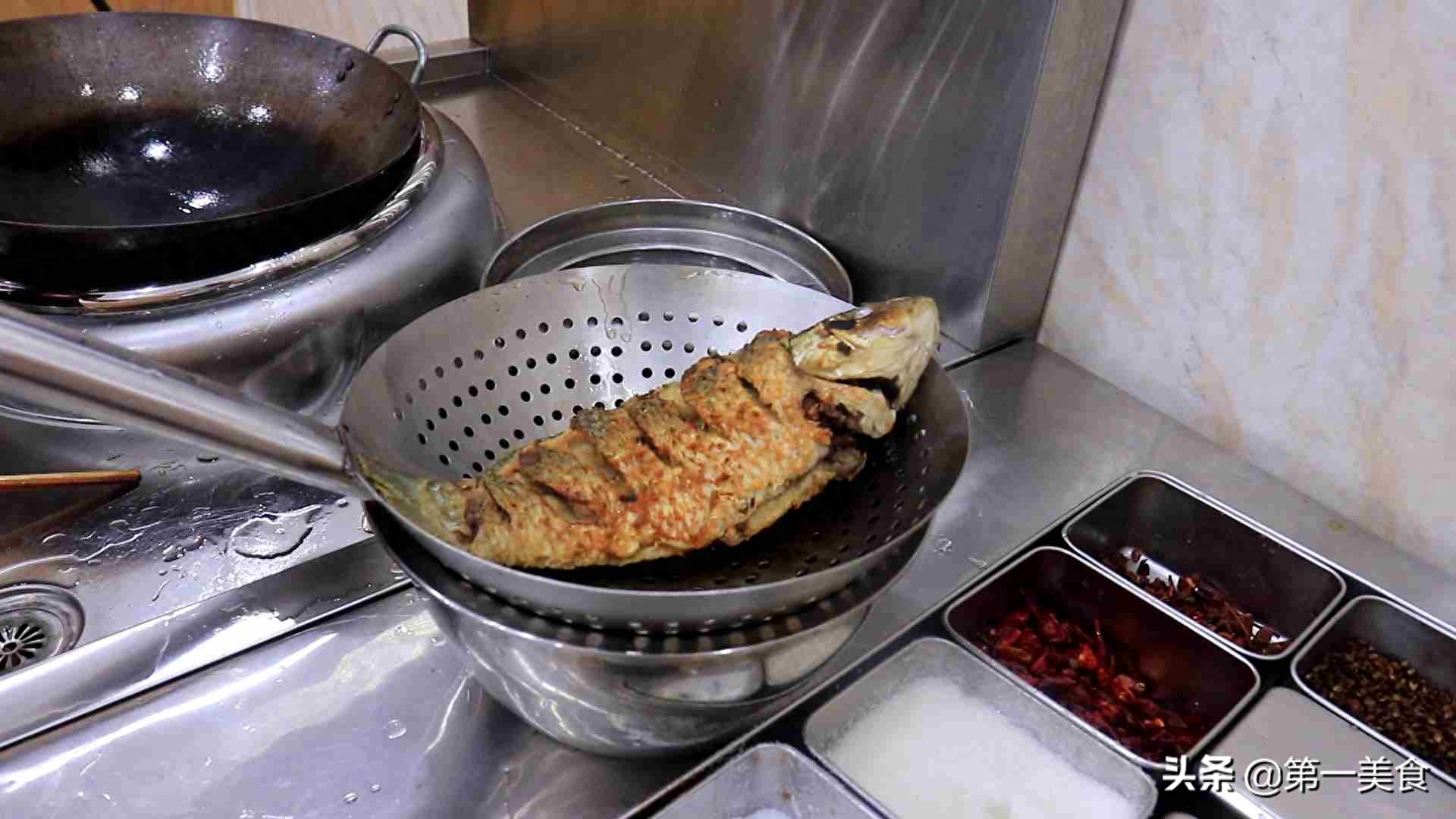 5.下面,我们把鱼煎一下,锅内烧油充分滑锅以后,倒出热油加入凉油,提着鱼头和鱼尾,把鱼轻轻的放入锅中,不停的摇晃锅让鱼均匀受热,鱼身没有定型的时候不要翻动,以免鱼皮破损,一面煎成金黄色时,翻过来煎另一面,保持小火煎5到6分钟,鱼身两面都煎成金黄色,鱼皮非常焦酥时倒出来控油。