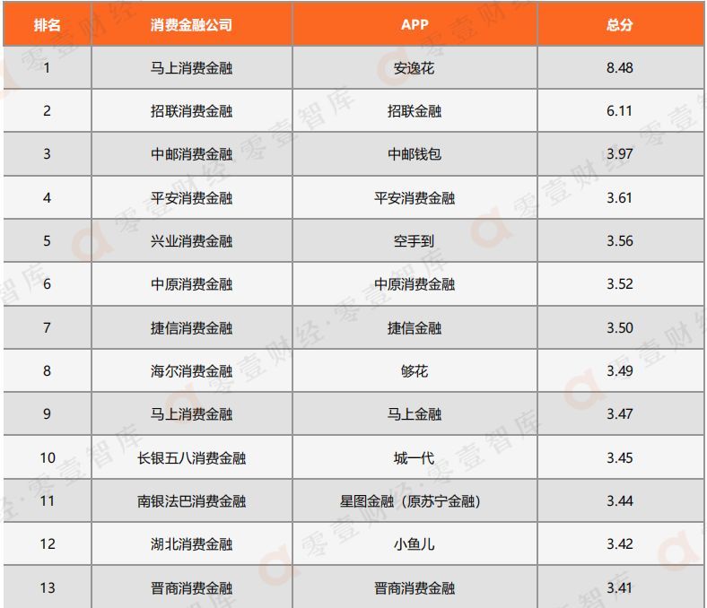 安逸花APP以总分8.48分名列第一,招联金融APP以6.11分位居第二,两家连续三次稳居行业前两名。此外,中邮钱包、平安消费金融、空手到、中原消费金融、捷信金融、够花、马上金融、城一代APP分别位列第3-10名。