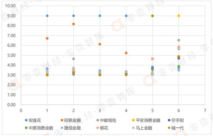 从日均活跃用户的评分来看,安逸花APP表现最为突出,为9分;招联金融APP位居第二名(5.23分),其余消费金融APP均位于3.-3.50分区间,分布较为集中。可以看到,整体用户黏性较低仍然是消费金融APP亟待解决的问题。