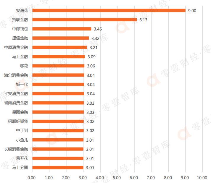 人均单日使用时长一定程度上可以反映用户依赖程度。平安消费金融APP月平均时长约13分钟,得9分,位列第一;第二名为小鱼儿(7.24分),月平均时长约9分钟。