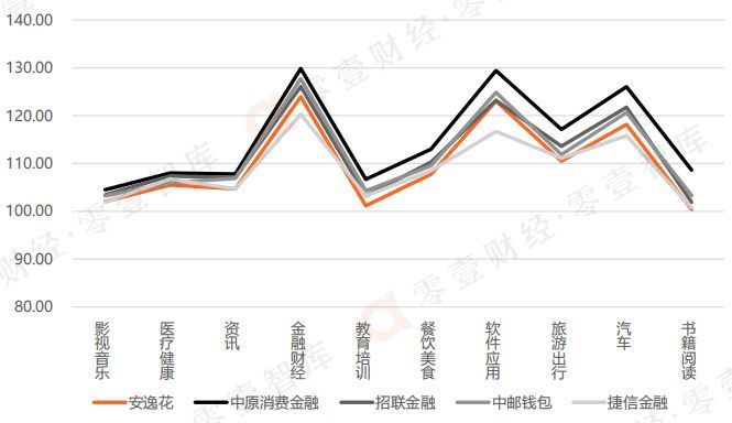 资料百度指数、零壹智库根据偏好度(TGI)数据,消费金融APP用户的兴趣偏好分布主要集中于金融财经、软件应用、汽车、旅游出行、餐饮美食、医疗健康、资讯、教育培训、影视音乐、书籍阅读等多个领域。
