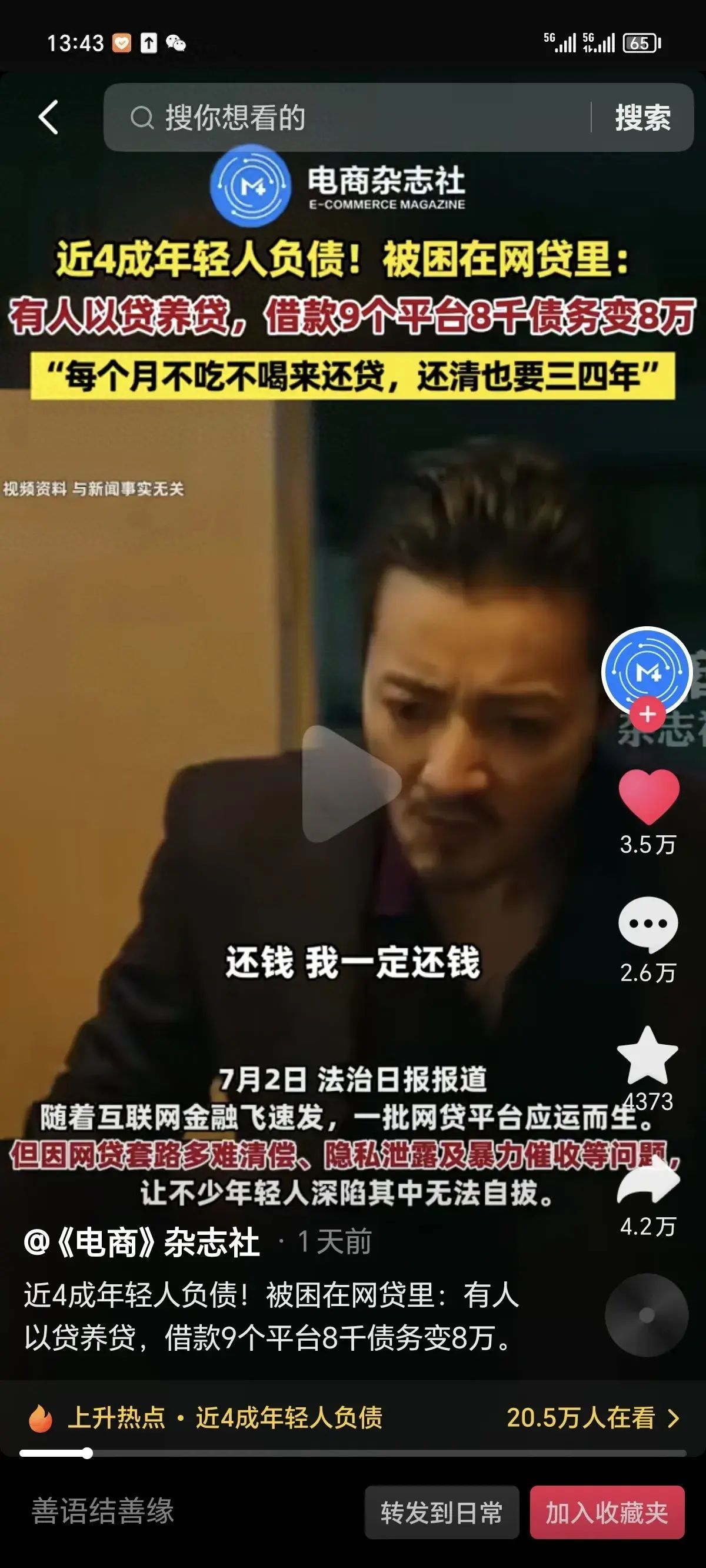 7.2日,据法制日报报道:近4层年轻人陷入贷款困局,被困在贷款里面无法自拔,有些人为了还贷款,通过以贷养贷的方式来偿还贷款,但是带来的是永无止境的还贷款!