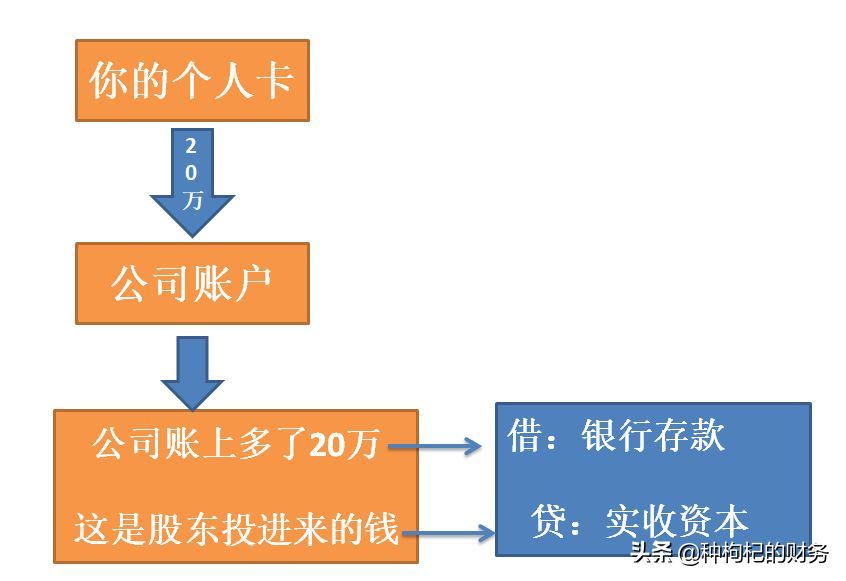 事物都有两面性,一件事情引起两个方面的后果。就像你注资20万这一件事情,一方面引起你公司户头增加了20万存款,这20万是干嘛的呢?是你公司实际收到的资本金,是你公司的实收资本。所以,一边记在“银行存款”,另一边记在“实收资本”。