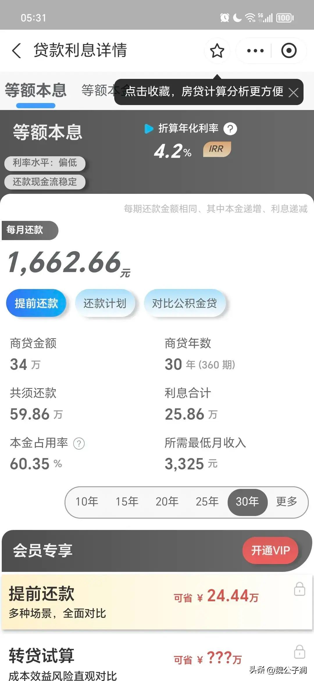 我的贷款总额是34万,按4.2的利率计算的话,我的月供应该是1662啊