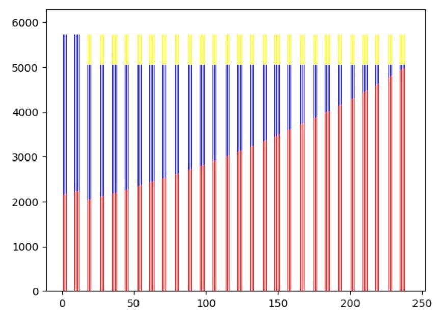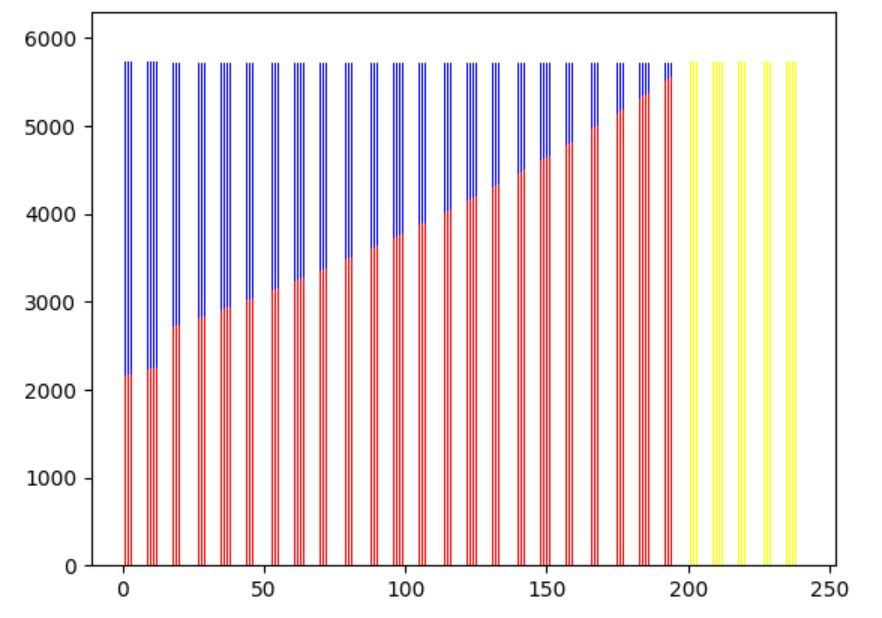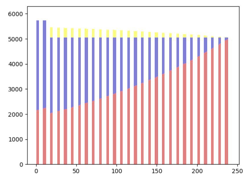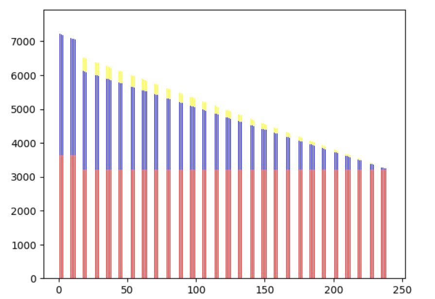def drawDiagramExtraPaid(months, capitals, interests, originalTotal, originalInterests, showOriginTotal=True): month_array = np.arange(1, months + 1, 1) capital_with_origin_interest = [0] * months height = interests for x in range(1, months): capital_with_origin_interest[x] = capitals[x] + originalInterests[x] l1 = plt.bar(month_array, originalTotal if showOriginTotal else capital_with_origin_interest, width=0.2, align='center', color='yellow') l2 = plt.bar(month_array, capitals, width=0.2, align='center', color='red') l3 = plt.bar(month_array, interests, width=0.2, align='center', color='blue', bottom=capitals) # plt.legend(handles = [l1, l2,l3], labels = ['每月少还' if showOriginTotal else '节省利息', '本金','利息'], loc = 'best',fontsize=20) plt.ylim(0, (capitals[0]+interests[0])*1.1) plt.show() def drawTableExtraPaid(months, capitals, interests, total_payment, originalTotal, originalInterests): paid_capital = [0] * months paid_interests = [0] * months saved_money = [0] * months paid_capital[0] = capitals[0] paid_interests[0] = interests[0] for x in range(1, months): paid_capital[x] = paid_capital[x - 1] + capitals[x] paid_interests[x] = paid_interests[x - 1] + interests[x] saved_money[x] = saved_money[x - 1] + (originalInterests[x] - interests[x] ) origin = pd.DataFrame([total_payment, capitals, interests, paid_capital, paid_interests,saved_money]) return pd.DataFrame(origin.values.T, columns=['还款额','还款本金','还款利息','已还本金','已还利息','累计节省'], index=np.arange(1, months + 1))通过参数showOriginTotal的取值,可以分别绘制每月少还的钱与当月节省利息的情况。下面分别绘制了等额本金和等额本息情况下,87.5万贷20年,在第一年还10万后还款和利息的变化情况。