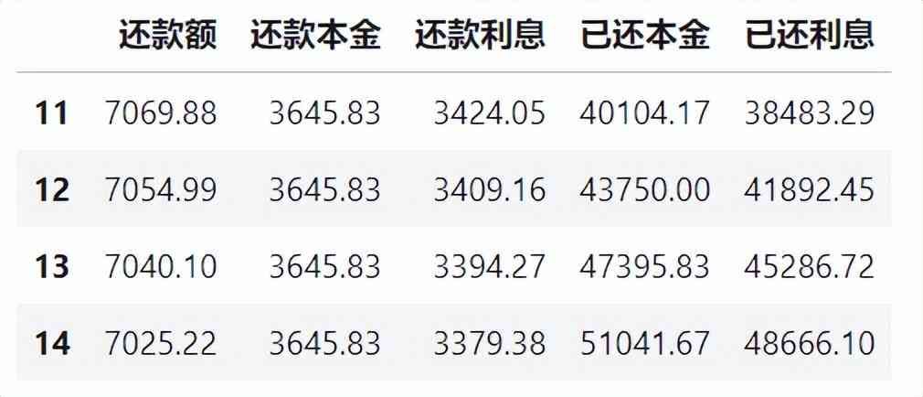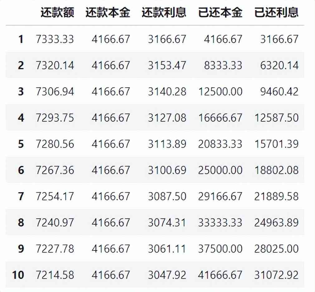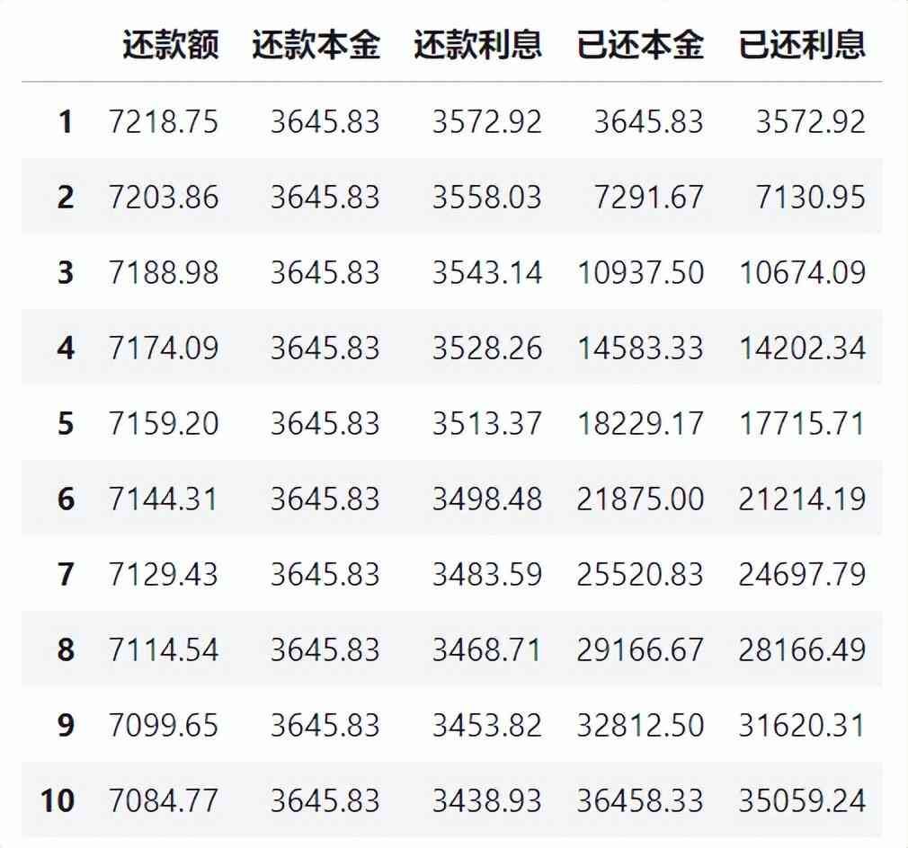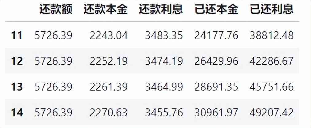 import pandas as pd def drawTable(months, fn, *args, **kwargs): capitals, interests, total_payment = fn(months, *args, **kwargs) paid_capital = [0] * months paid_interests = [0] * months paid_capital[0] = capitals[0] paid_interests[0] = interests[0] for x in range(1, months): paid_capital[x] = paid_capital[x - 1] + capitals[x] paid_interests[x] = paid_interests[x - 1] + interests[x] origin = pd.DataFrame([total_payment, capitals, interests, paid_capital, paid_interests]) return pd.DataFrame(origin.values.T, columns=['还款额','还款本金','还款利息','已还本金','已还利息'], index=np.arange(1, months + 1))我们运行一下知乎上的例子,看看头几年还款的本金、利息等:
