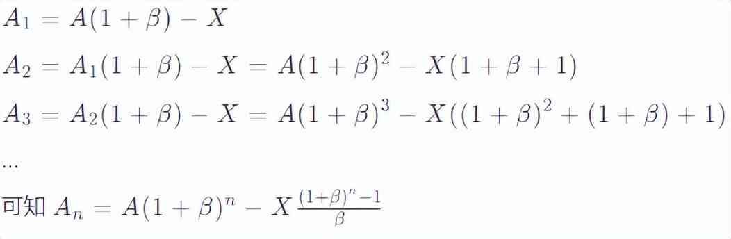 等额本息 的计算方法有些复杂,参考用Python深度解读房贷利率文中的解法,设A为本金,第i个月月末所欠银行本金为Ai,每月所还贷款总额为X,月利率为β, 则有: