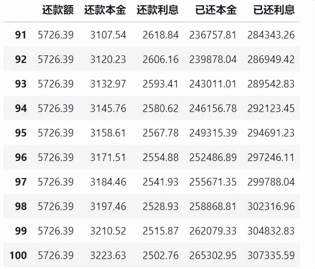 可以看到第96期(第8年年终)时,本金还了25万,但利息已经还了近30万了,和之前文中例子的数据是可以对得上的。
