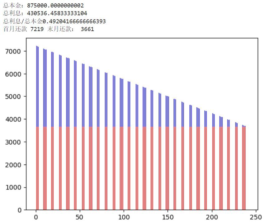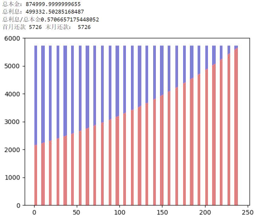 如图,蓝色是所还利息,红色是所还本金。可以看出本金每月不变,利息逐月递减的特征。