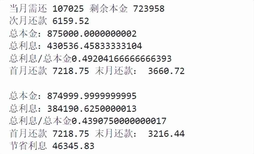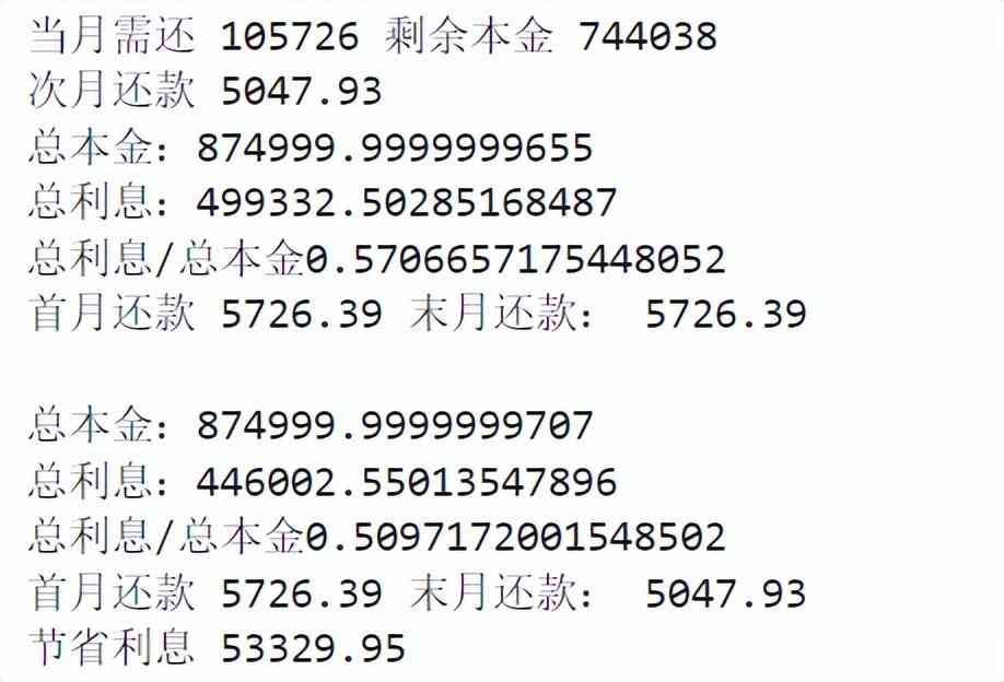 那假如选择等额本金呢?第一个月要还的金额为7218.75元,此后每个月少还14.89元,直至20年后还完。通过描述可知,贷款87.5万,贷20年,等额本息每月还款5726.39元,等额本金首月还款7218.75元。假设文中的贷款未使用公积金,计算时利率为固定利率,根据网上的贷款计算器可知此时的贷款年利率为4.9%。