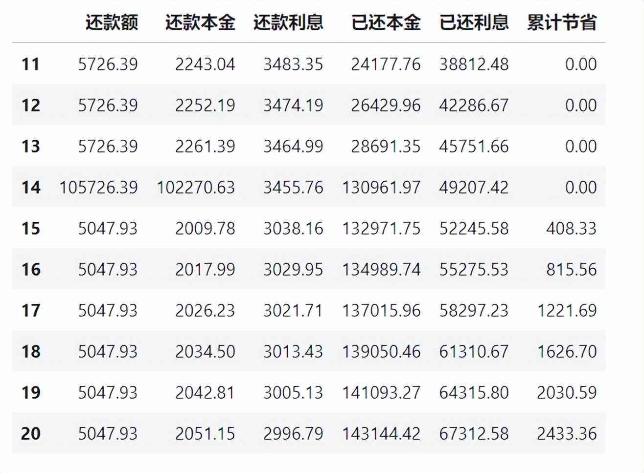 我们下面先写个求解首月月供的函数,以及通过缩短年限逼近上月月供总额和月供本金的函数。而后计算“月供不变,年限缩短”模式下节省的具体利息。def getFirstPaid(months, principal, rate, capitalAveraged): month_rate = rate / 12 monthly_capital = principal / months monthly_payment = principal * month_rate * (1 + month_rate) ** months / ((1 + month_rate) ** months - 1) interests1 = principal * month_rate if capitalAveraged: return monthly_capital + interests1, monthly_capital else: return monthly_payment, monthly_payment - interests1 def getLeftMonths(leftMonthsMax, capitalPaidMax, paidMax, leftPrincipal, rate, capitalAveraged): lastPaid, lastCapitalPaid, lastMonths = 0, 0, 0 for i in range(leftMonthsMax, 1, -1): paid, capitalPaid = getFirstPaid(i, leftPrincipal, rate, capitalAveraged) if paid > paidMax or (capitalAveraged and capitalPaid > capitalPaidMax): return lastMonths, lastPaid, lastCapitalPaid else: lastPaid, lastCapitalPaid, lastMonths = paid, capitalPaid, i def extraPaidWithFixedPaid(months, principal, rate, capitalAveraged, extraPaidList: list): capitals, interests, total_payment = normalPaid( months, principal, rate, capitalAveraged) extraPaidList.sort(key=lambda x: x[0]) originCapital, originInterests, originTotal = capitals.copy(), interests.copy(), total_payment.copy() left_principal = [0] * months left_principal[0] = principal for x in range(0, months): if x < months - 1: left_principal[x + 1] = left_principal[x] - capitals[x] def normalPaidOffset(left_months, principal, rate, capitalAveraged, offset, left_months2): month_rate = rate / 12 monthly_capital = left_principal[offset] / left_months monthly_payment = left_principal[offset] * month_rate * (1 + month_rate) ** left_months / ((1 + month_rate) ** left_months - 1) for i in range(0, left_months): interests[offset + i] = left_principal[offset + i] * month_rate if capitalAveraged: capitals[offset + i] = monthly_capital total_payment[offset + i] = monthly_capital + interests[offset + i] else: total_payment[offset + i] = monthly_payment capitals[offset + i] = total_payment[offset + i] - interests[offset + i] if i == 0: print("次月还款 %.2f" % total_payment[offset + i]) if offset + i + 1 < months: left_principal[offset + i + 1] = left_principal[offset + i] - capitals[offset + i] for i in range(left_months, left_months2): interests[offset + i] = 0 capitals[offset + i] = 0 total_payment[offset + i] = 0 return realMonth = months for x, y in extraPaidList: capitalParam = capitals[x] capitals[x] = capitals[x] + y left_principal[x + 1] = left_principal[x] - capitals[x] total_payment[x] = capitals[x] + interests[x] maxMonth, maxPaid, maxPaidCapital = getLeftMonths(months - x - 1, capitalParam, total_payment[x - 1], left_principal[x + 1], rate, capitalAveraged) normalPaidOffset(maxMonth, left_principal[x + 1], rate, capitalAveraged, x + 1, months - x - 1) realMonth = x + 1 + maxMonth print("当月需还 %.2f 剩余本金 %.2f 下月需还:%.2f 原本剩余账期:%d,当前剩余账期:%d, 账期缩短:%d" %(total_payment[x], left_principal[x + 1],total_payment[x + 1], months - x - 1,maxMonth, months - x - 1 - maxMonth)) printStatistics(originCapital, originInterests, originTotal, months) print("") printStatistics(capitals, interests, total_payment, realMonth) print("节省利息 %.2f" % (np.sum(originInterests) - np.sum(interests))) return capitals, interests, total_payment, originTotal, originInterests a, b, c, d, e = extraPaidWithFixedPaid(12 * 20, 875, 0.049, True, [(13, 1)]) drawDiagramExtraPaid(12 * 20, a, b, d, e) drawTableExtraPaid(12 * 20, a, b, c, d, e)[10:20]a, b, c, d, e = extraPaidWithFixedPaid(12 * 20, 875, 0.049, False, [(13, 1)]) drawDiagramExtraPaid(12 * 20, a, b, d, e) drawTableExtraPaid(12 * 20, a, b, c, d, e)[10:20]可以看出,虽然缩短年限的本质也是重新做一次贷款,但确实可以节省很多利息。