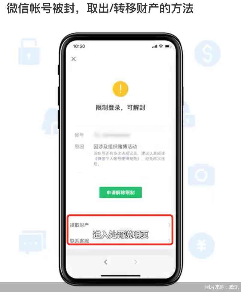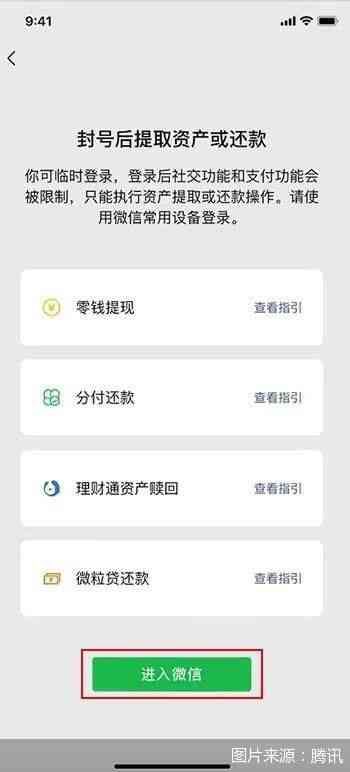 在封号后提取资产或还款的相关事宜上,用户可以按照页面提示,根据指引自主开启临时财产入口登录微信,并进行零钱提现、零钱通转出、银行储蓄转出、理财通资产赎回以及微粒贷还款等操作。财产入口开启后,48小时内有效,且仅限于财产提现或还款操作,微信其他社交、支付等功能无法使用。