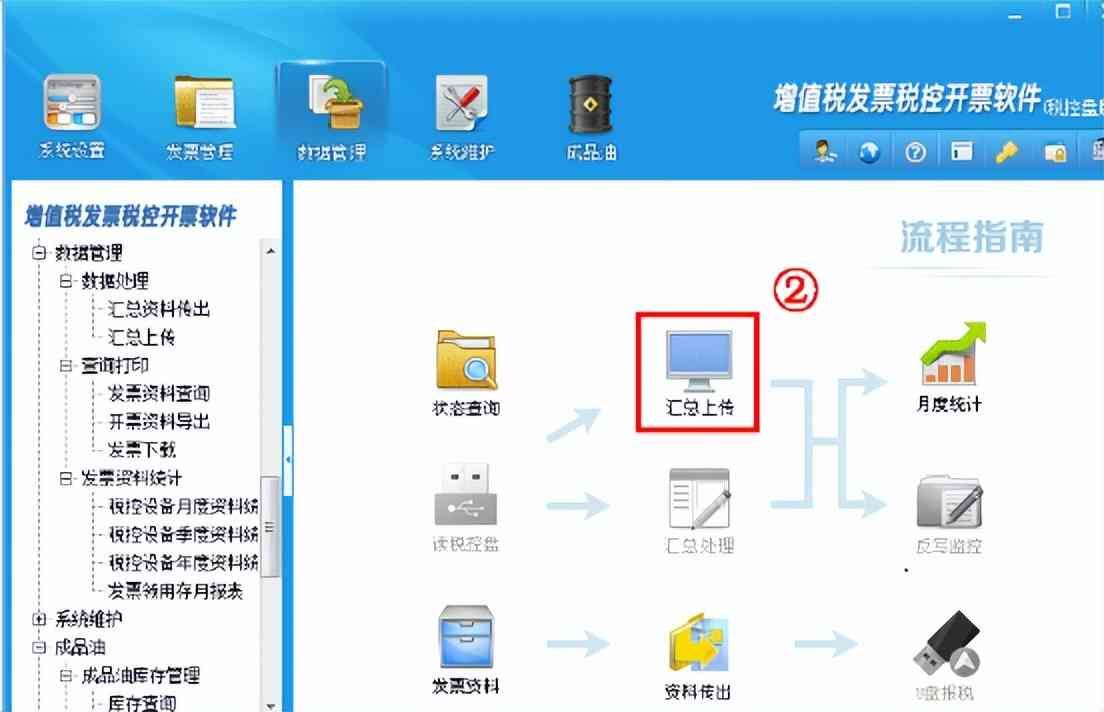 第三步:登录软件 ,点击【数据管理】--【数据处理】--【汇总上传】--【反写监控】开票截止时间变成下个月即为清卡成功。