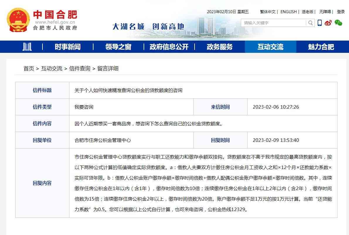 大皖新闻讯 近日,有 网友在合肥市人民政府官方网站互动交流版块留言,咨询如何快速精准查询公积金的贷款额度?对此,官方进行了答复。