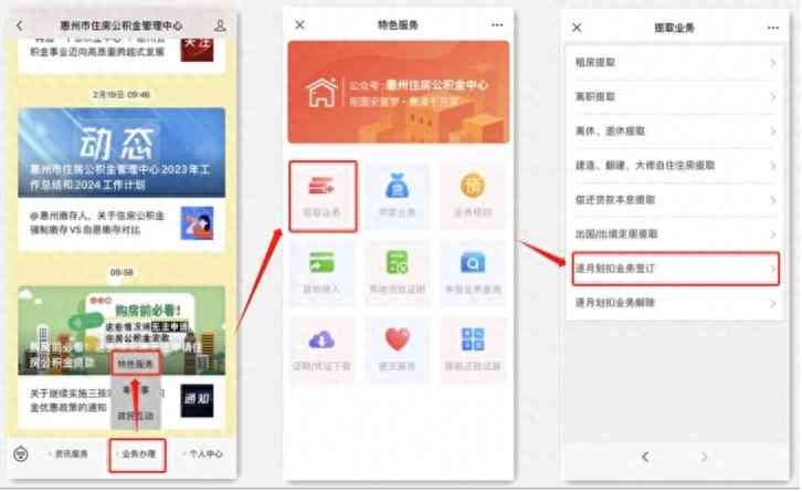1、在惠州市住房公积金管理中心公众号首页下方菜单栏,依次点击【业务办理】-【特色服务】-【提取业务】-【逐月划扣业务签订】,进入逐月划扣业务签订申请页面: