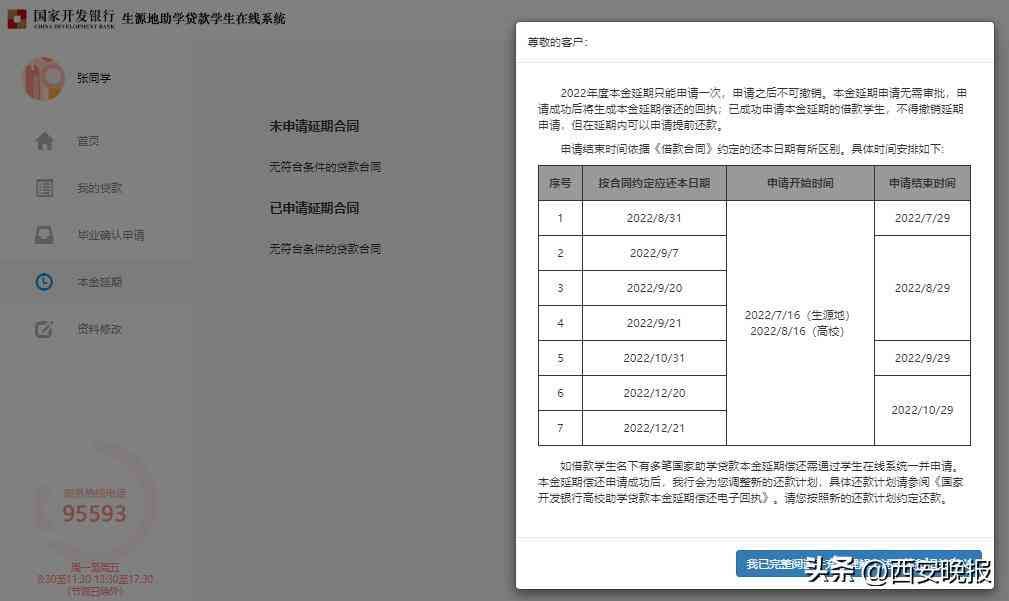 (一)登录学生在线系统,点击菜单列“本金延期”,弹框“政策提示弹框”,提示框下方设置按钮“我已完整阅读并充分理解上述政策和相关释义”;