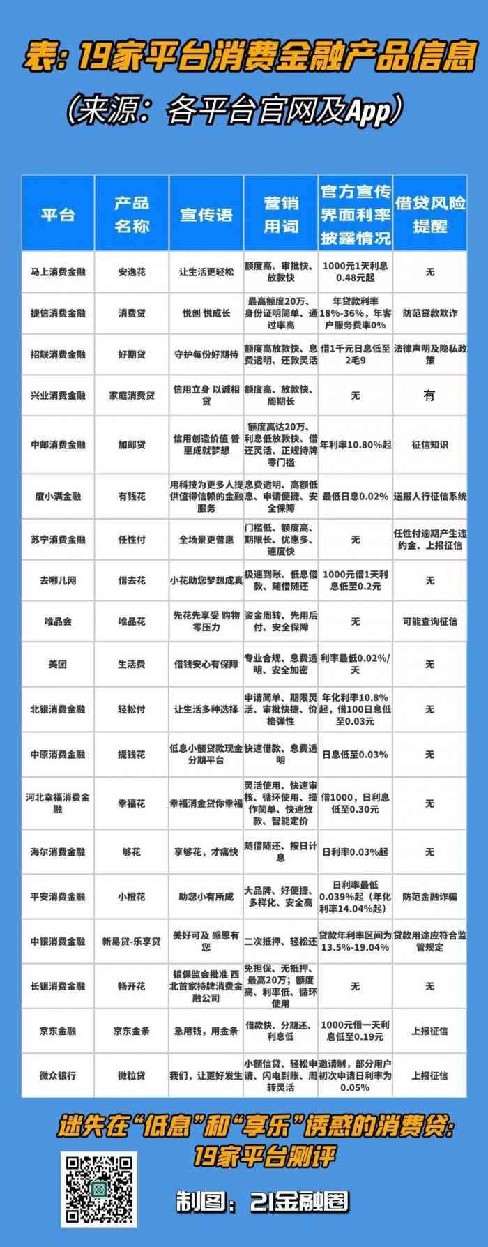 21金融圈选取了19家平台进行调研,分别为马上消费金融、捷信消费金融、招联消费金融、兴业消费金融、中邮消费金融、度小满金融、苏宁消费金融、去哪儿网、唯品会、美团、北银消费金融、中原消费金融、河北消费金融、海尔消费金融、平安消费金融、中银消费金融、长银消费金融、京东金融、微众银行。