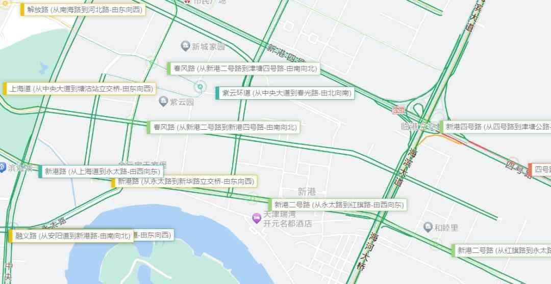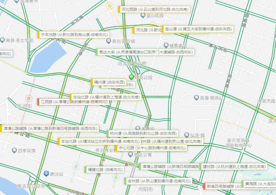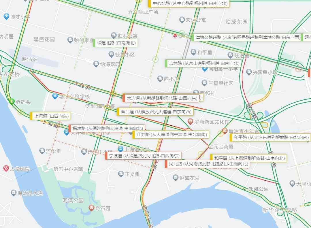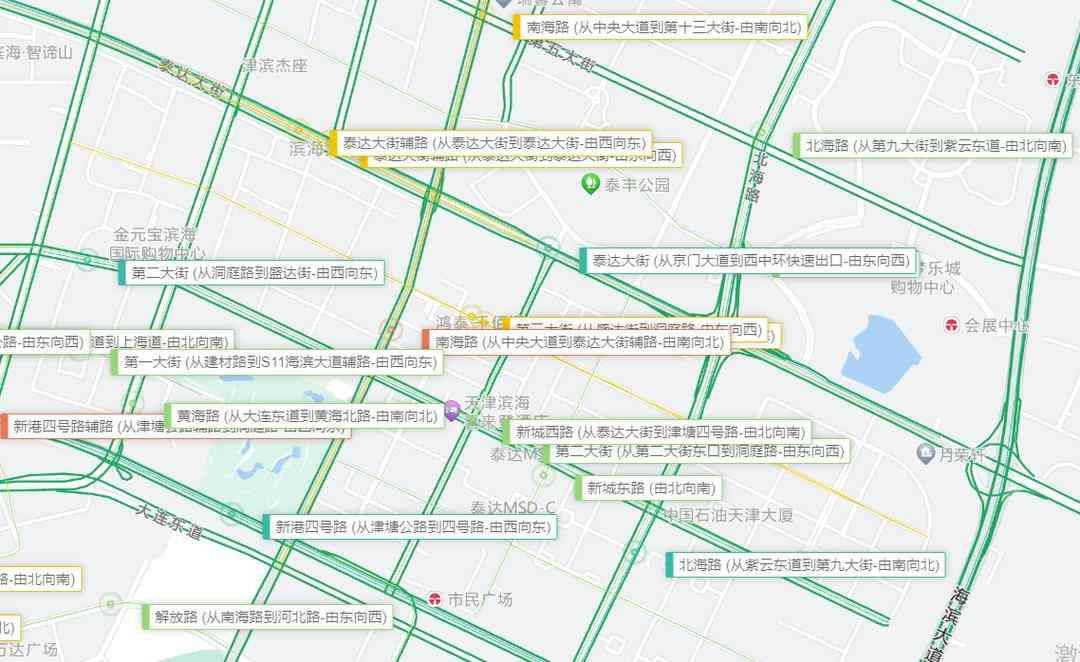 工作日早高峰7-9时,晚高峰17-19时,红色区域为车多缓行区域,黄色区域为流量增加区域: