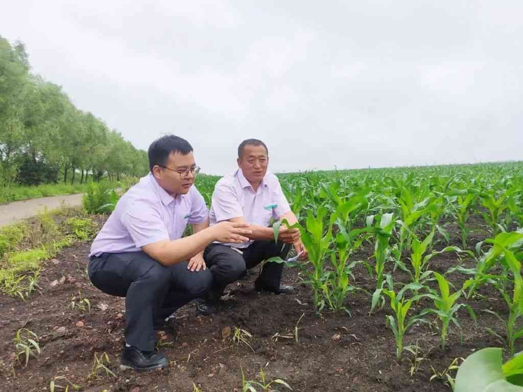 ▲农行吉林通化三源浦支行客户经理与刘家村村书记庞宝强现场查看庄稼长势 摄影/ 宁明扬