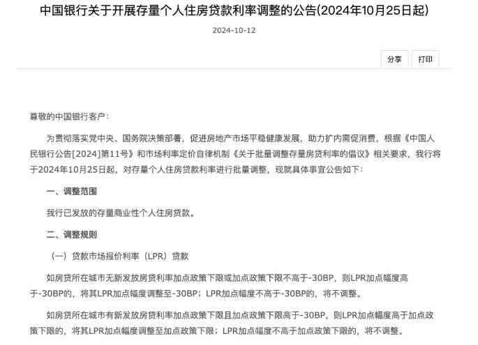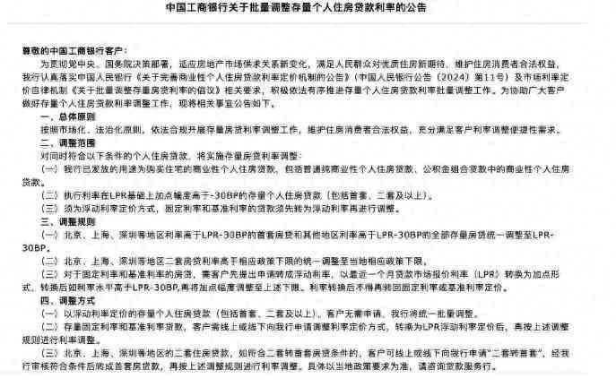 10月12日,工商银行、农业银行、中国银行、建设银行等多家银行陆续发布公告,10月25日起,将对存量个人房贷利率进行批量调整。除贷款在北京、上海、深圳等地区且为二套房贷款的情形外,其他符合条件的房贷利率都将调整为贷款市场报价利率LPR-30BP。