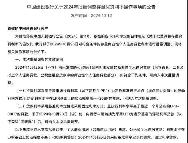 但需要注意的是,采用固定利率方式的贷款客户需要主动申请,以建设银行发布的执行细则为例,贷款利率采用基准利率定价或采用固定利率方式,且执行利率水平高于最近一个月公布的LPR-30BP的贷款,须于2024年10月23日(含)前,向我行申请转换为采用LPR为定价基准的浮动利率贷款(以下简称“固转浮”)后,可纳入本次批量调整。