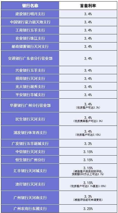 如民生银行天河支行、广发银行五羊新城支行、广州银行天河南支行等均表示最低利率可达3.3%;广州农商银行东圃支行首套最低利率为3.25%。
