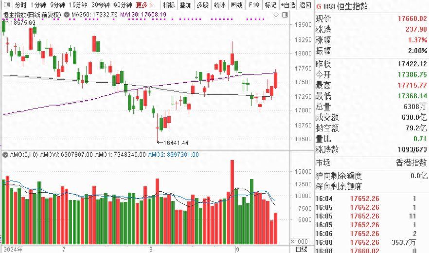 中秋节期间,港股恒指大涨,周一上涨0.31%,周二大涨1.37%。上周五以来,市场对本周美联储50个基点的降息预期不断升温,道指、黄金齐创历史新高。此外,9月17日,华为商城显示,华为三折叠手机——华为Mate XT非凡大师预约人数已达626万。