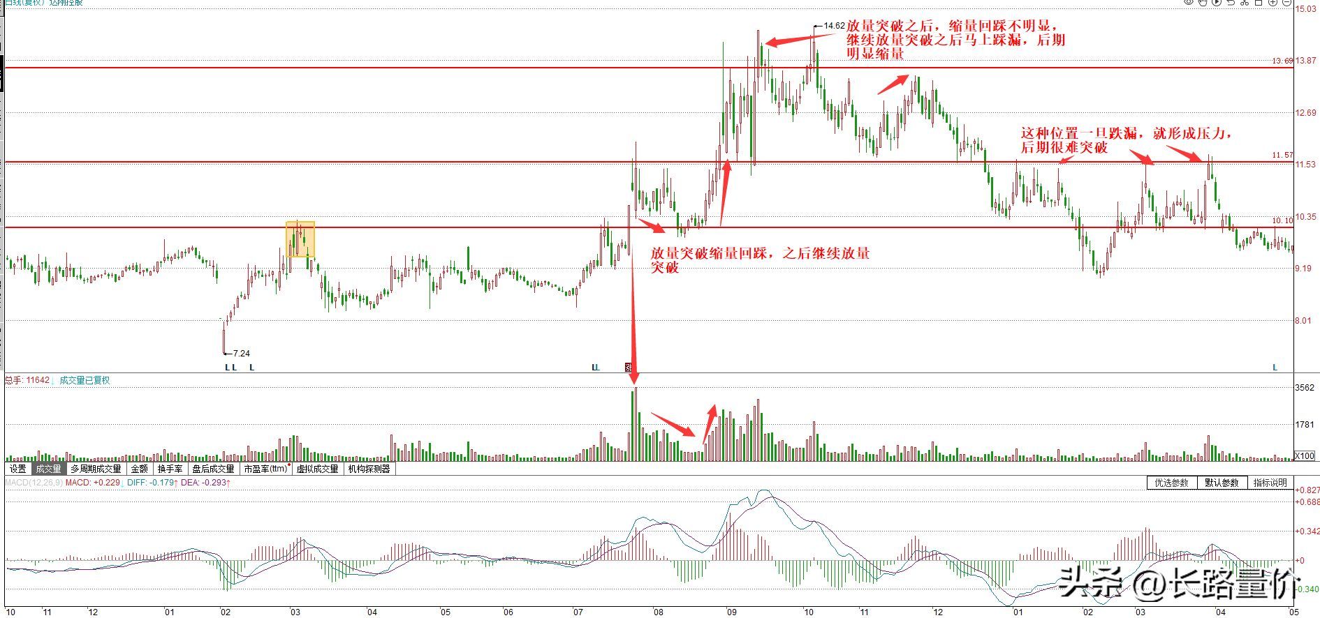 因为在前面放量都没有突破上去,而后期缩量突破上去的概率极低,后期只要是把这种放量的位置跌破,这种位置就会形成一个巨大的压力区,后面在出现反弹上涨过程中,遇到这种位置就会有回调震荡。