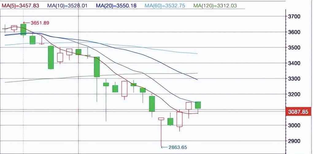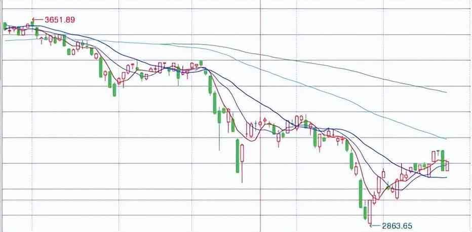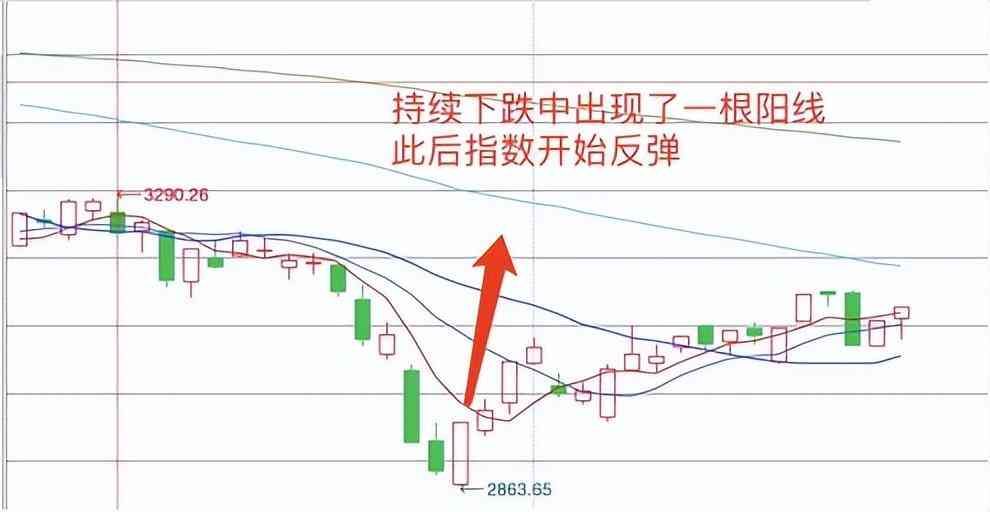 第一组看阴阳。比如在某只股票或指数的震荡或下跌趋势末期突然出现一根阳线,可能代表着做多力量增长了,暗示着股价可能会开始反转向上;相反地,如果在某只股票的震荡或上涨趋势末期突然出现一根阴线,可能代表着做空力量来了,暗示着股价可能会开始反转向下。同时,阴线和阳线的实体越长,说明当时股价下跌或上涨的动力越强。以上证指数为例,4月中下旬经历了一轮持续下跌,到4月27日最低跌到2863.25点时突然出现了一根实体较长的阳线,并由此拉开了一轮反弹。