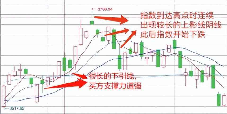 第二组看影线长短。如果某只股票的K线图上出现了很长的下影线,往往代表买方支撑力道强,如果下影线很长的K线出现在股价下跌趋势中,再配合放大的成交量,可能暗示股价有反弹回升的可能;但如果这种K线出现在股价上涨趋势末期,再配合放大的成交量,可能暗示着大量资金要卖出,此时就要注意卖出时机。上影线则相反,K线图上出现了很长的上影线,往往代表卖方力量强,如果这种K线出现在股价上涨趋势末期再配合成交量放大,则暗示股价可能一时难以突破,短期内可能会重新进入震荡甚至下跌期。比如2021年12月上证指数达到37点高位时,就接连出现了几根上影线很长的阴线,此后市场开始下跌。