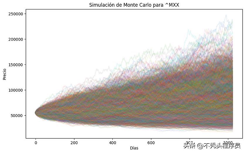 模拟将生成一个图表,显示股票的各种模拟价格路径。考虑到回报的历 史可变性,这种方法提供了股票市场潜在未来情景的概率视图。