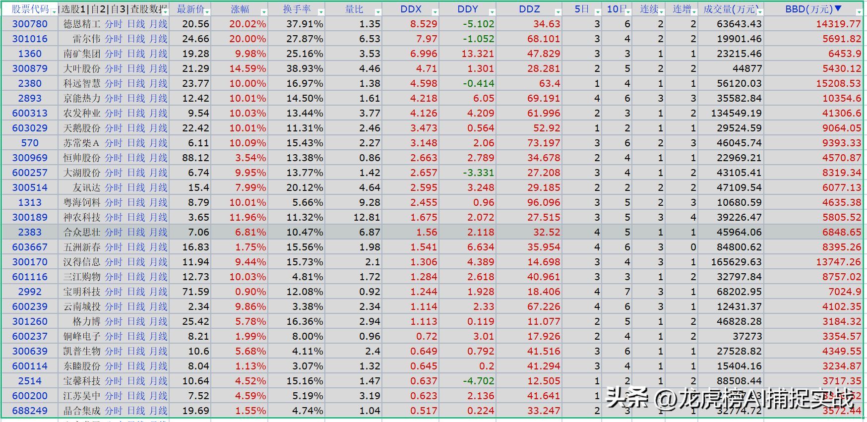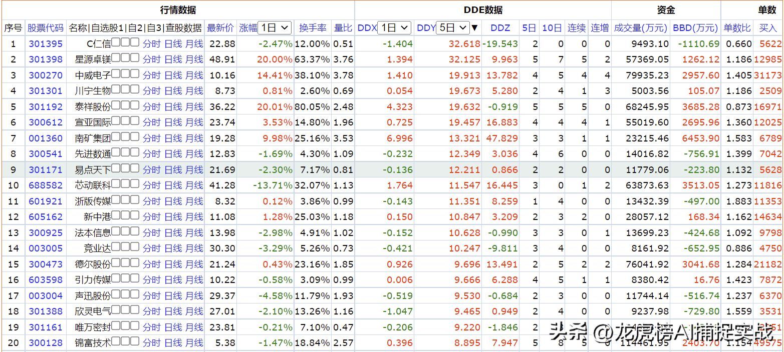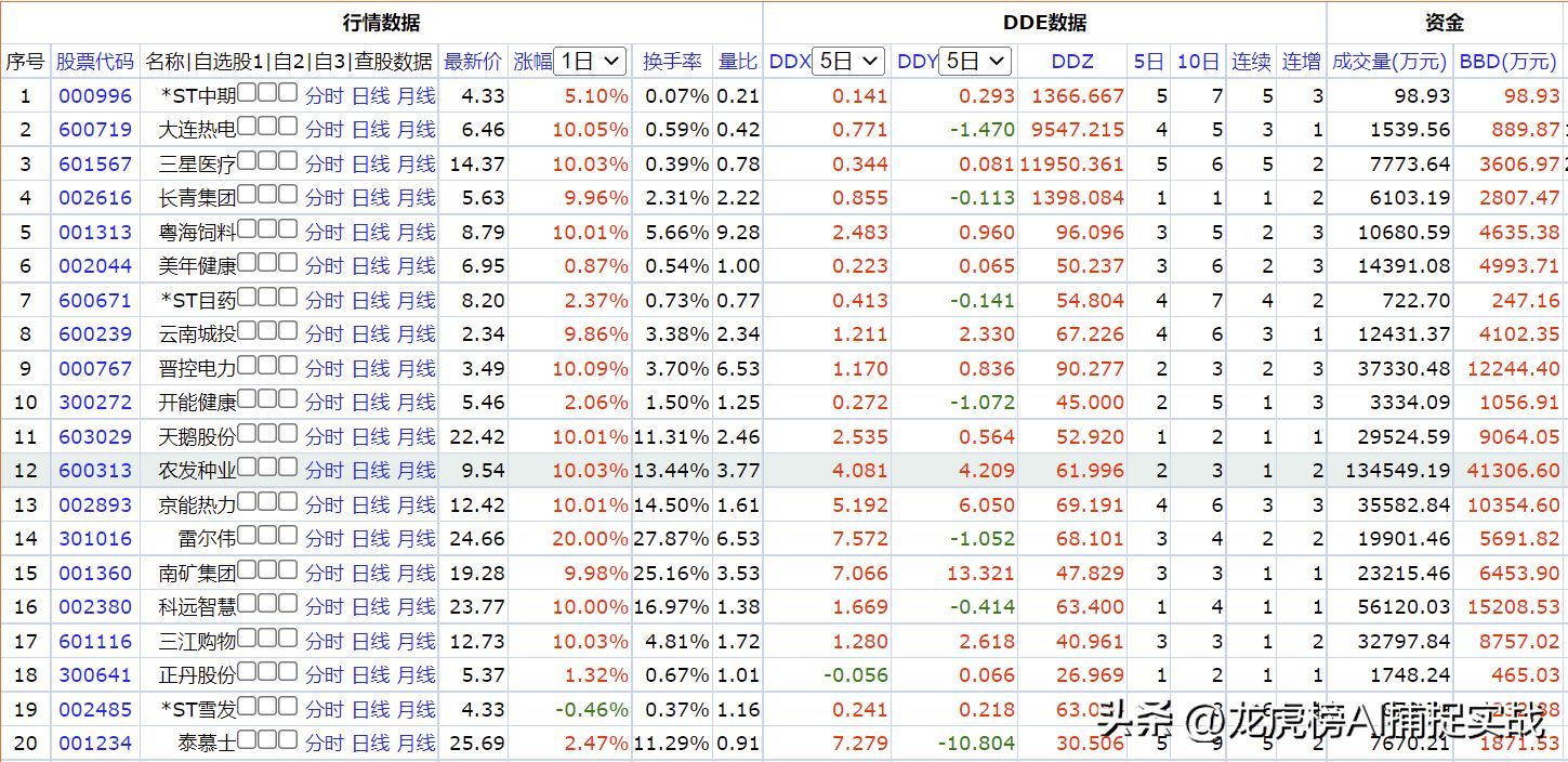 大家可作为学习和验证,如果是追涨停的建议前三只3780 德恩精工、301016 雷尔伟、001360 南矿集团,不追涨停的建议6313农发种业。不过农发种业的DDX数值只有当日达到了4.13,前几日都不高,如果DDX延续几日红盘或值在增加,那会更能增加选股的成功率。