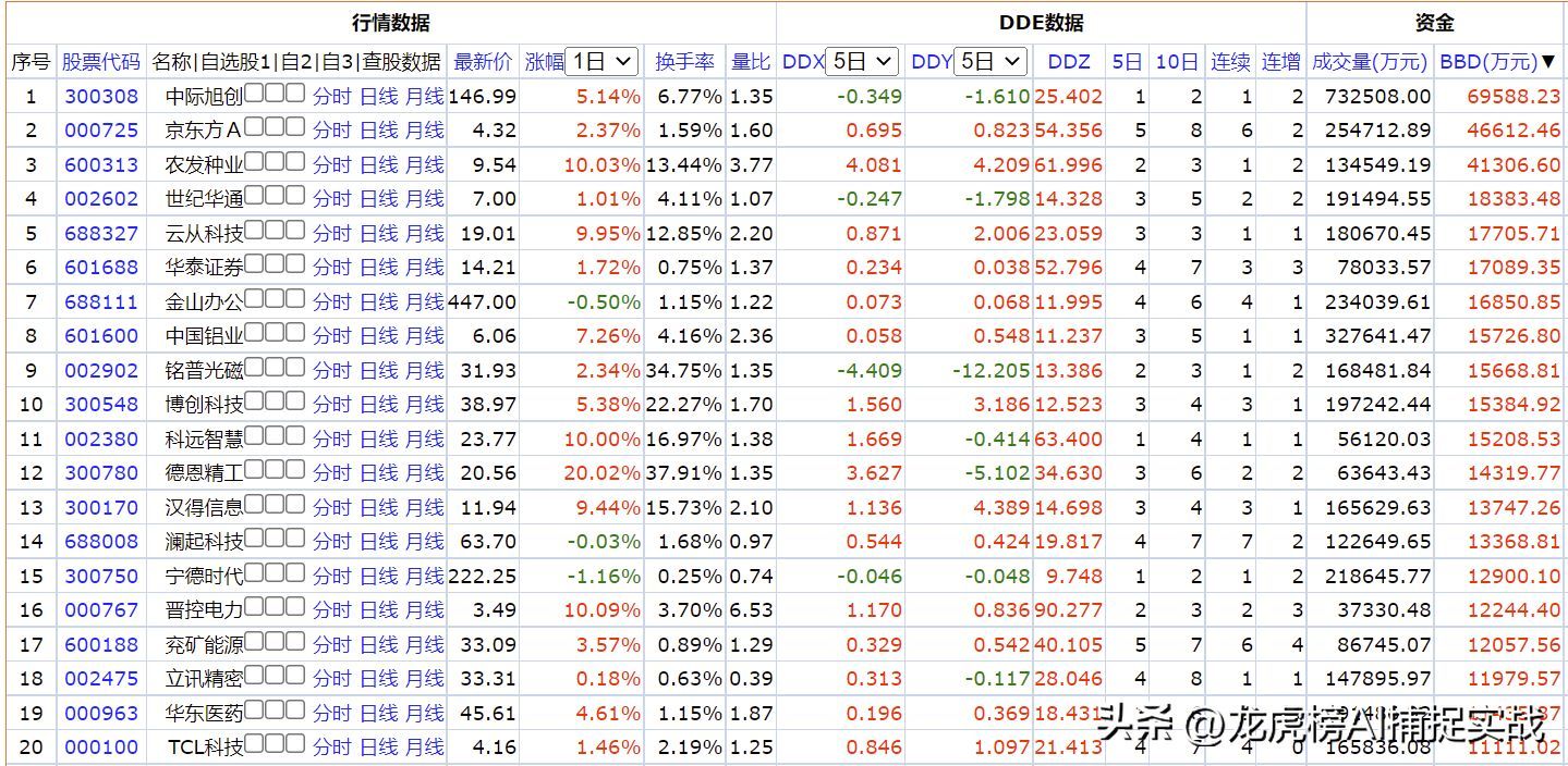 以下是B B D排行榜:中际旭创、京东方、农发种业居前三。