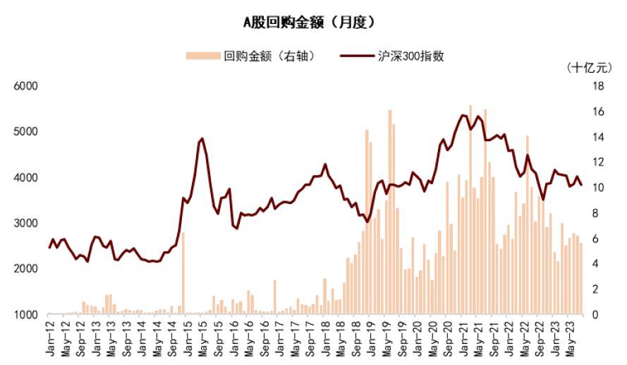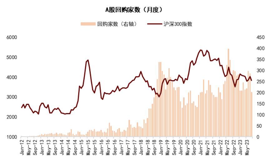 2018年10月《中华人民共和国公司法》修正案发布,标志着A股市场回购制度逐步与海外市场接轨,修正案增加了回购情形、简化了回购程序、建立了库存股制度,此后A股上市公司回购行为及实施规模显著增加。据Wind统计,2020年至2022年上市公司年均实施回购家数为1079家,年均实施回购规模达到972亿元。2023年初以来(截至8月20日,下同),上市公司已实施回购家数997家,实施回购金额452亿元。